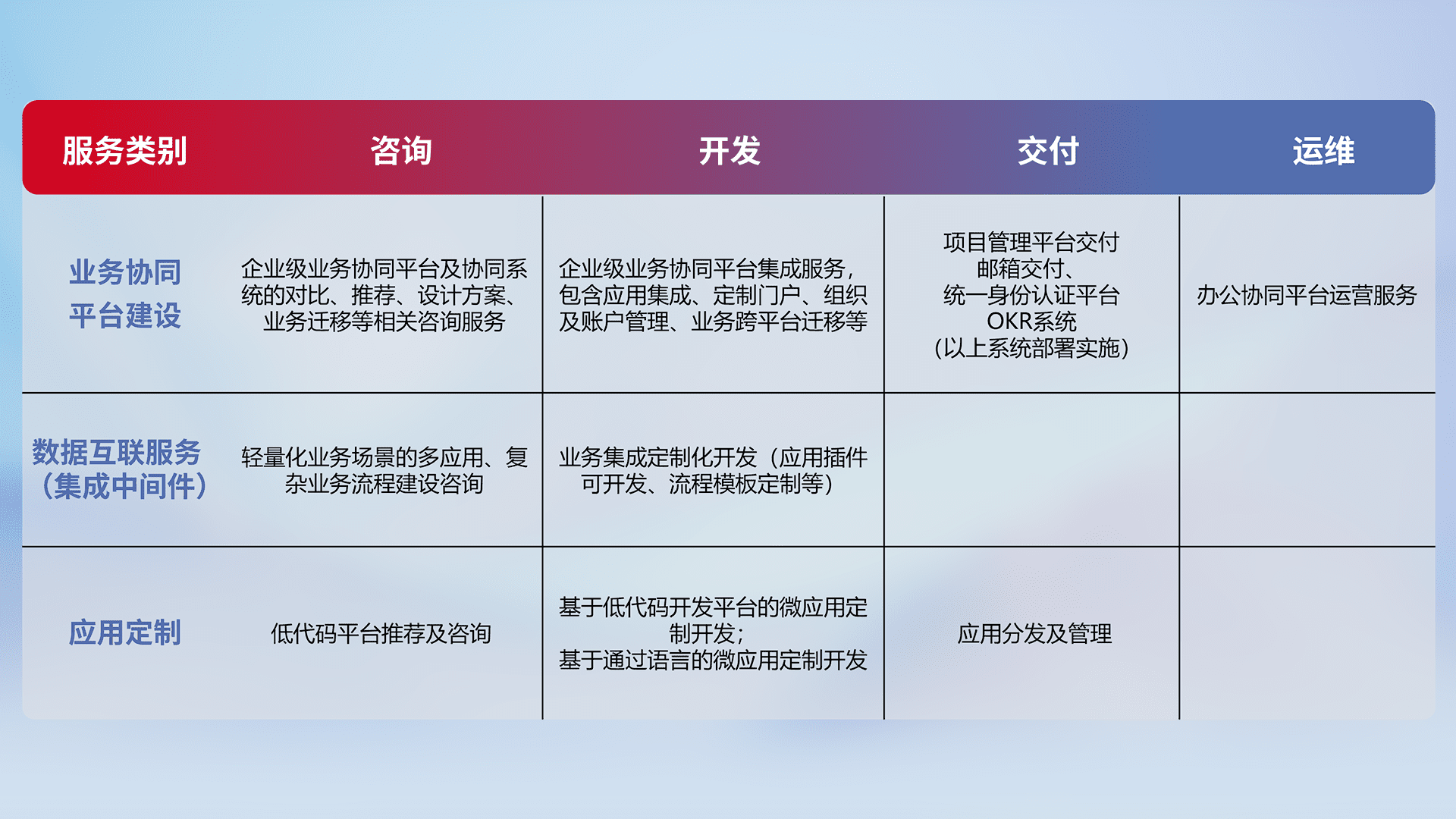 针对钉钉、、、企微、、IDaas等平台级产品提供产品的规划、、、方案、、、交付、、定制化开发等服务,,实现如统一协同办公、、、智能客户服务、、、、混合会议管理、、智能数据查询、、等业务场景,,实现数字化转型。。。